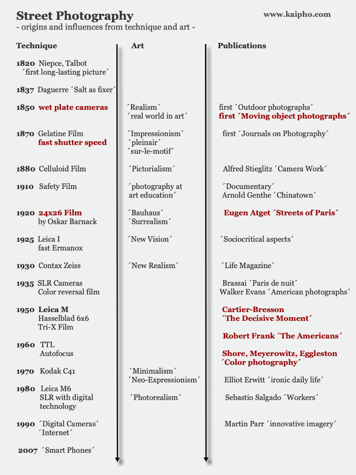 The following overview is not to be understood as an academic chronology. Its just an attempt to combine the influences out of time period, technique and art to the development of street photography.The thematic birthplace of street photography is Paris in the middle of the last century in terms of street = 'real life outside from the studio'.